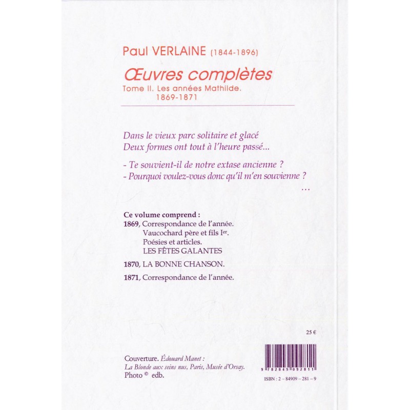 Correspondance. Vaucochard père et fils Ier. Poésies diverses. Articles de critique. Les Fêtes galantes. La Bonne Chanson.